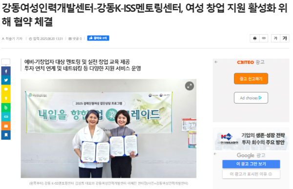 [STARTUP TODAY] 강동여성인력개발센터-강동K-ISS멘토링센터, 여성 창업 지원 활성화 위해 협약 체결